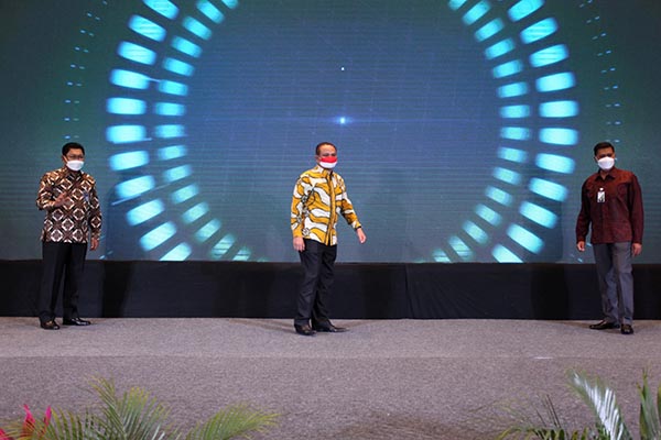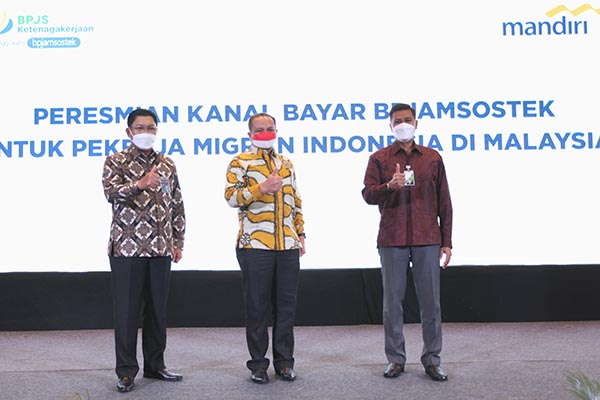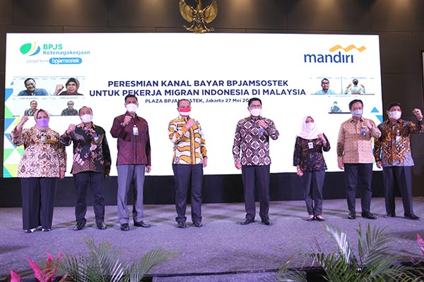Direktur Utama Bank Mandiri Darmawan Junaidi Bersama Sekretaris Utama Badan Pelindungan Pekerja Migran Indonesia (BP2MI) Tatang Budie Utama Razak dan Direktur Utama BPJAMSOSTEK Anggoro Eko Cahyo (kiri ke kanan) sedang berbincang usai meresmikan kanal pembayaran iuran BPJAMSOSTEK untuk PMI Malaysia di Jakarta, Kamis, 27 Mei 2021. Bank Mandiri melalui Mandiri International Remittance (MIR) melayani pembayaran iuran BPJAMSOSTEK bagi pekerja migran Indonesia (PMI) di Malaysia agar lebih mudah dan cepat. Caranya, PMI hanya perlu melakukan registrasi pada website BPJAMSOSTEK untuk mendapatkan kode pembayaran, lalu datang ke salah satu cabang MIR di Malaysia untuk melakukan pembayaran iuran.