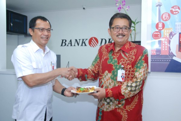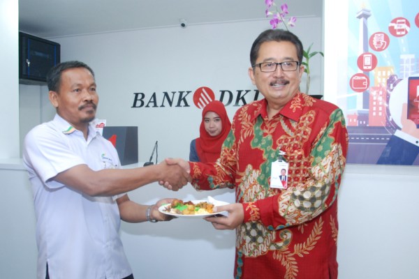 Direktur Bisnis Bank DKI, Antonius Widodo Mulyono (kanan) menyerahkan buku tabungan Monas Bank DKI kepada nasabah Bank DKI disela-sela pembukaan Kantor Kas Pasar Baru Metro Atom di Jakarta (31/10). Per Oktober 2017, Bank DKI sudah memiliki 29 kantor layanan di pasar-pasar DKI Jakarta. Total Bank DKI tercatat memiliki 237 kantor layanan yang terdiri dari 28 kantor Cabang konvensional, 3 Cabang Syariah, 59 Cabang Pembantu, 12 Cabang Pembantu Syariah, 115 Kantor Kas Konvensional, 5 Kantor Kas Syariah, 5 Payment Point dan 10 Kantor Fungsional. (*)