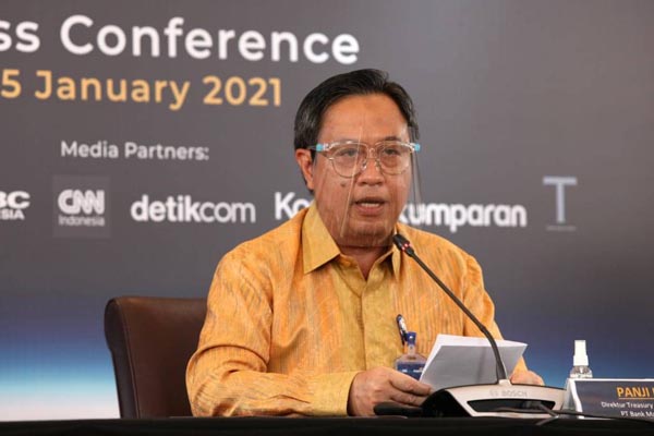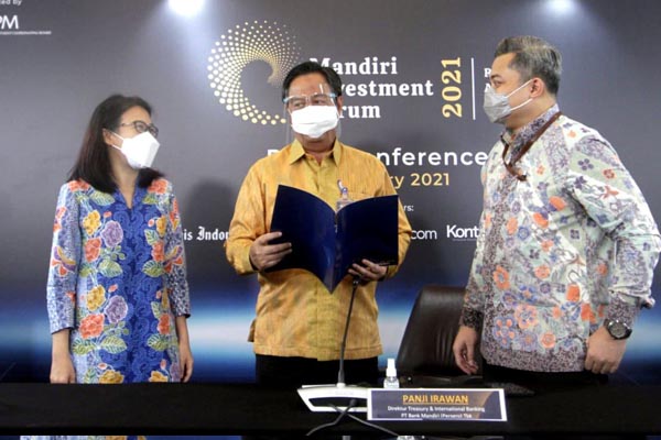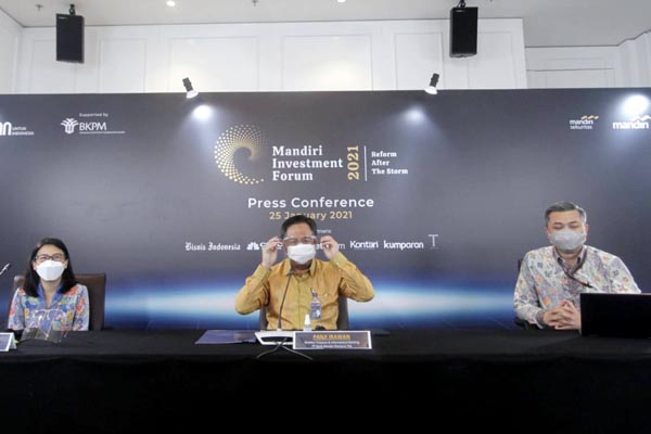 Direktur Mandiri Sekuritas Silva Halim, Direktur Treasury&International Banking Bank Mandiri Panji Irawan dan Chief Economist Bank Mandiri Andry Asmoro (kiri ke kanan) sedang berbincang sebelum konferensi pers pelaksanaan Mandiri Investment Forum 2021 di Jakarta, Senin, 25 Januari 2021. Bank Mandiri bersama Mandiri Sekuritas dan didukung oleh BKPM akan menggelar Mandiri Investment Forum (MIF) 2021 secara virtual pada 1-5 Februari 2021. Forum bertajuk Reform After the Storm ini akan diikuti lebih dari 10 ribu investor, termasuk sekitar 500 investor asing atau perusahaan asing, perwakilan kedutaan besar, dan nasabah Kantor Luar Negeri Bank Mandiri, yang mengelola aset hingga lebih dari USD4 triliun.