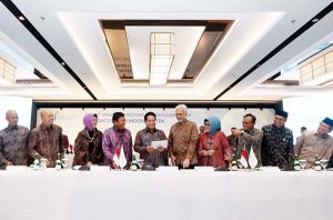 Direktur Utama BSI Hery Gunardi (kelima kiri) bersama Komisaris Utama BSI Adiwarman Azwarkarim (kelima kanan) berbincang bersama Direktur Retail Banking Ngatari (kiri), Direktur Finance & Strategy Ade Cahyo Nugroho (kedua kiri), Direktur Compliance & Human Capital Tribuana Tunggadewi (ketiga kiri), Wakil Direktur Utama Bob Tyasika Ananta (keempat kiri), Direktur Risk Management Tiwul Widyastuti (keempat kanan), Komisaris Independen Komaruddin Hidayat (ketiga kanan), Komisaris Independen M Arief Rosyid Hasan (kedua kanan) dan Ketua Dewan Pengawas Syariah BSI Hasanudin (kanan) saat pelaksanaan Rapat Umum Pemegang Saham Luar Biasa BSI di Jakarta, Jumat, 23 September 2022.