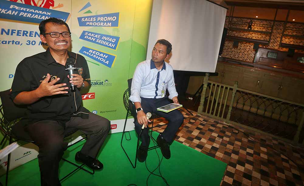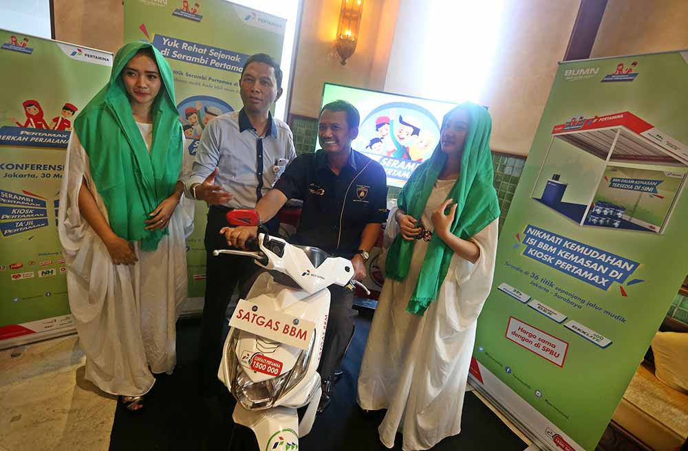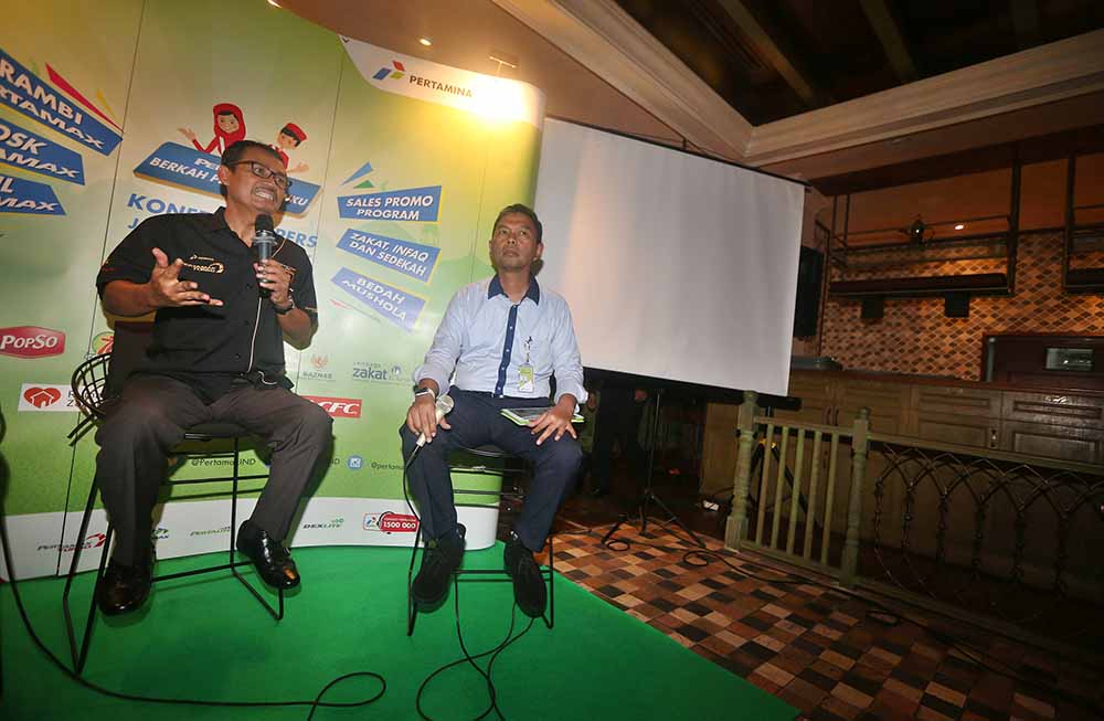 Vice President Retail Fuel Marketing PT Pertamina (Persero) Jumali (kanan) dan VP Corporate Communication PT Pertamina (Persero) Adiatma Sardjito (kiri) berfoto bersama disela acara jumpa pers Pertamina hadirkan Pertamax berkah perjalananku di Jakarta, Selasa 30 Mei 2017. Menyambut Ramadhan dan Idul Fitri 1438 H Pertamina hadirkan pertamax berkah perjalananku dengan menyiapkan berbagai program seperti penyedian tajil gratis, bedah Mushola, layanan zakat, serambi pertamax, kiosk pertamax dan sales promo di SPBU pertamina.(Budi Urtadi)