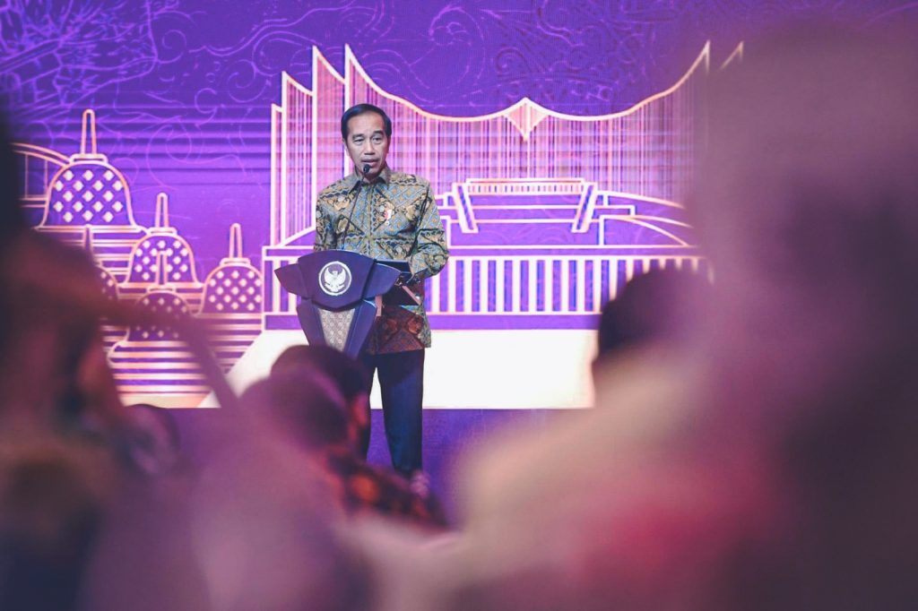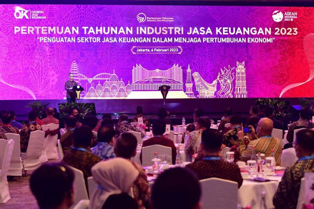 Pertemuan Tahunan Industri Jasa Keuangan merupakan wadah penyampaian arah kebijakan Otoritas Jasa Keuangan (OJK) kepada Industri Jasa Keuangan, serta sebagai bentuk akuntabilitas dan transparansi kinerja OJK kepada public. PTIJK 2023 mengambil tema “Penguatan Sektor Jasa Keuangan Dalam Menjaga Pertumbuhan Ekonomi”. Foto: Biro Pers Sekretariat Presiden
