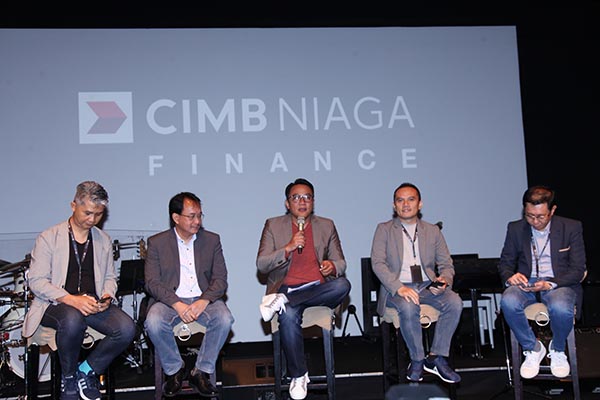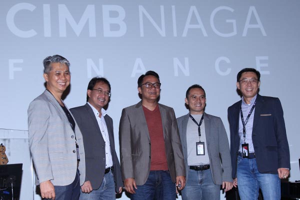 Presiden Direktur CIMB Niaga Finance Ristiawan Suherman (tengah) bersama Chief of Credit & Risk Antonius Herdaru, Collection & Recovery Director Danis V Bimawan, Finance & Strategy director, M Imron Rosyadi Nur dan Sales & Acquisition Director Kurniawan Kartawinata (kiri ke kanan) berbincang saat meresmikan penggunaan logo baru (rebranding) di Jakarta, Senin 9 Maret 2020. Perubahan logo tersebut menjadi salah satu langkah CIMB Niaga Finance untuk semakin memperkuat positioning sebagai anak perusahaan yang terus bersinergi dengan induk usaha yaitu PT Bank CIMB Niaga Tbk. Perubahan logo tersebut dilakukan dalam rangka transformasi bisnis dan memperluas segmentasi pembiayaan. Pada kesempatan itu, CIMB Niaga Finance juga meluncurkan aplikasi CNAF Mobile.