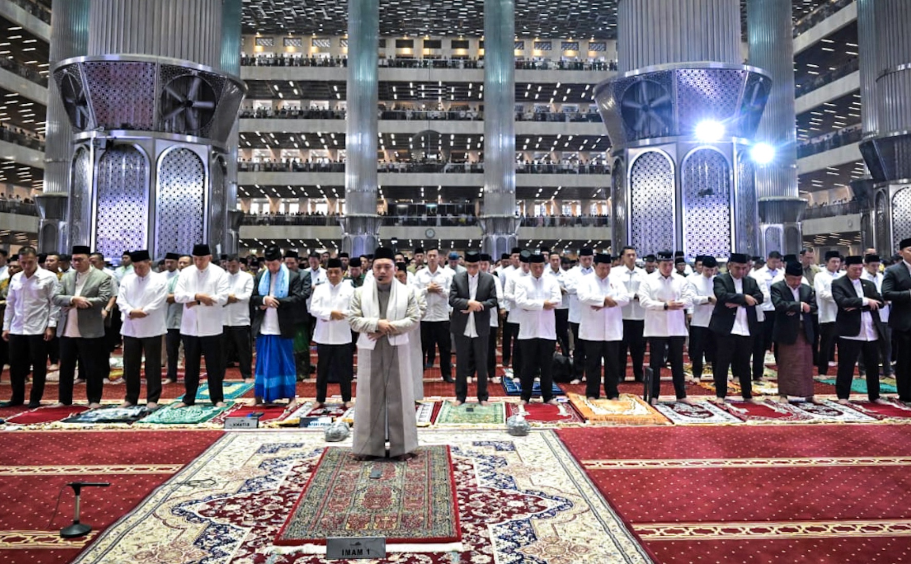 Suasana khidmat menyelimuti Masjid Istiqlal yang dipenuhi ribuan jemaah. Presiden Prabowo tampak khusyuk mengikuti seluruh rangkaian ibadah.