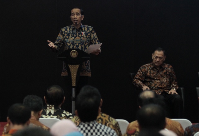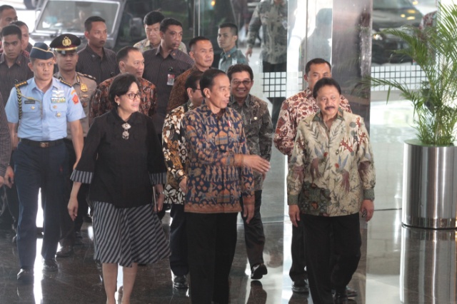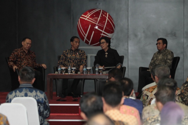 Presiden Joko Widodo (kiri) didampingi Gubernur Bank Indonesia Agus DW Martowardoyo,Menteri Keuangan Sri Mulyani,Ketua Dewan Komisioner OJK Mulyaman D.Hadad melakukan dialog dengan pelaku pasar modal di Bursa Efek Indonesia, Jakarta, Rabu 4 Juli 2017. Kunjungan kerja tersebut untuk meninjau pergerakan indeks harga saham gabungan (IHSG) secara langsung serta melakukan dialog dengan pelaku pasar modal.(Budi Urtadi)