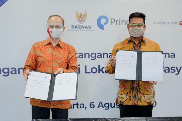 Wakil Ketua Badan Amil Zakat Nasional (BAZNAS) Zainul Bahar Noor, Resident Representative, UNDP Indonesia Christophe Bahuet, CEO PT Principal Asset Management Agung Budiono dan CEO PT Ammana Fintek Syariah Lutfi Adhiansyah (kiri ke kanan) berfoto bersama usai penandatanganan kerjasama Pemanfaatkan Keuangan Sosial Syariah dan Filantropi di Jakarta Kamis 6 Agustus 2020.United Nations Development Programme (UNDP) bersama dengan BAZNAS, PT Principal Asset Management (Principal) dan PT Ammana Fintek Syariah (Ammana) hari ini menandatangani kerjasama kemitraan baru untuk mendukung pemulihan COVID-19 dan pembangunan ekonomi untuk masyarkat rentan di Indonesia. Kerjasama ini diharapkan dapat berkontribusi dalam mencapai Pembangunan Berkelanjutan (Sustainable Development Goals) dan memberikan dampak signifikan kepada masyarakat melalui pemanfaatan dana filantropi Islam dan jasa keuangan.