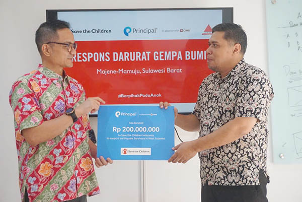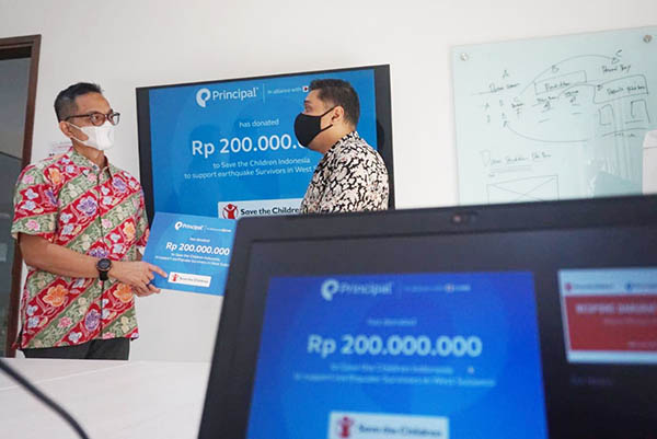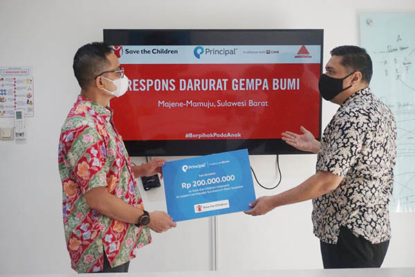 Direktur Syariah Investment Management PT Principal Asset Management, Fadlul Imansyah (kiri) menyerahkan Donasi untuk Respon Darurat Gempa Bumi kepada Chief of Humanitarian and Resilience Program Save the Children Indonesia, Dino Satria yang dilakukan di Jakarta, Jumat, 26 Maret 2021. Principal Asset Management menyerahkan donasi sebesar Rp200.000.000 kepada Save the Children Indonesia untuk memenuhi kebutuhan penyintas gempa bumi di Sulawesi Barat. Donasi tersebut berupa perlengkapan pendidikan, kebersihan dan kesehatan bagi anak-anak dan keluarga penyintas gempa .