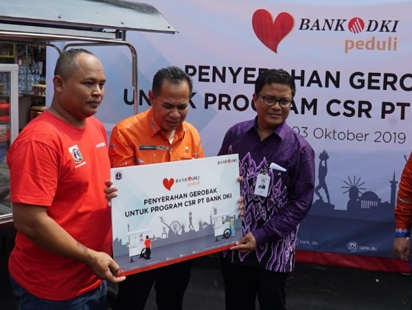 Direktur Kredit UMK & Usaha Syariah Bank DKI, Babay Parid Wazdi (paling kanan) secara simbolis melakukan penyerahan Gerobak untuk program CSR Bank DKI kepada para Pedagang sekitar Masjid Agung Sunda Kelapa yang diwakili oleh Wakil Walikota Jakarta Pusat, Irwandi (tengah) di Jakarta, (03/10). Untuk dapat memfasilitasi permodalan bagi para pelaku UMKM, Bank DKI memiliki produk kredit Mikro Monas 25, 75, dan 500 dengan plafon dari Rp25 juta hingga Rp500 juta yang dapat dimanfaatkan sebagai akses tambahan modal kerja maupun investasi. (*)