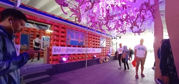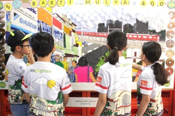 pembuatan instalasi dengan botol bekas yang merupakan edukasi sejak awal untuk murid SD agar mulai peduli sampah, pemanfaatan daur ulang, mengurangj sampah plastik dan bergaya hidup sehat sejalan dengan program BNI go green. (*)