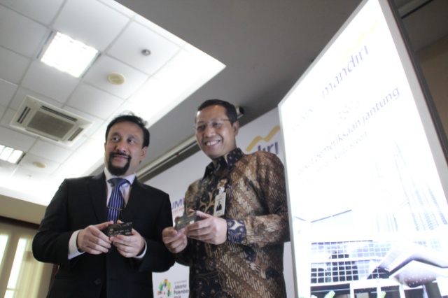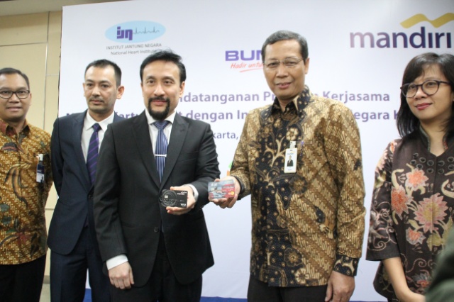 Direktur Retail Banking Bank Mandiri Tardi (kedua kanan), SVP Credit Card Group Bank Mandiri Vira Widyasari (kanan), Chief Operating Officer Institut Jantung Negara (IJN) Kuala Lumpur Akmal Arief Mohamed Fauzi (kedua kiri), Head of Marketing and Madical Tourism IJN Akim Affandi Ahmad (kiri) sedang berjabat tangan usai penandatanganan perjanjian kerjasama di Jakarta, Rabu 6 September 2017. Bank Mandiri membantu penderita penyakit jantung menjalani perawatan medis di IJN Kuala Lumpur melalui program diskon 38% untuk paket pemeriksaan jantung dengan menggunakan Mandiri kartu Kredit. Hingga akhir Juli 2017, jumlah Mandiri Kartu Kredit yang telah diterbitkan mencapai 4,6 Juta kartu dengan sales volume mencapai Rp 18,8 triliun, dimana Rp1,2 triliun di antaranya dilakukan di luar negeri.(*)