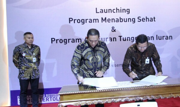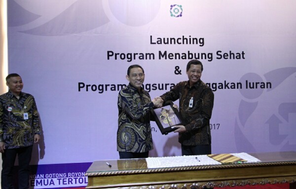 Direktur Retail Banking Bank Mandiri Tardi (kanan) dan Direktur Keuangan & Investasi BPJS Kesehatan Imam Kemal Santoso sedang bertukar naskah perjanjian kerja sama dukungan program Menabung Tabungan Sehat BPJS Kesehatan di Jakarta, Senin (18/12). Dalam kerja sama ini, Bank Mandiri akan memberikan prioritas bagi peserta baru dan lama BPJS Kesehatan untuk membuka rekening Tabungan Sehat di Bank Mandiri dengan fitur auto debet untuk memudahkan pembayaran iuran peserta. Hingga Oktober 2017, pembayaran iuran BPJS Kesehatan melalui Bank Mandiri telah mencapai Rp36,2 triliun. (*)