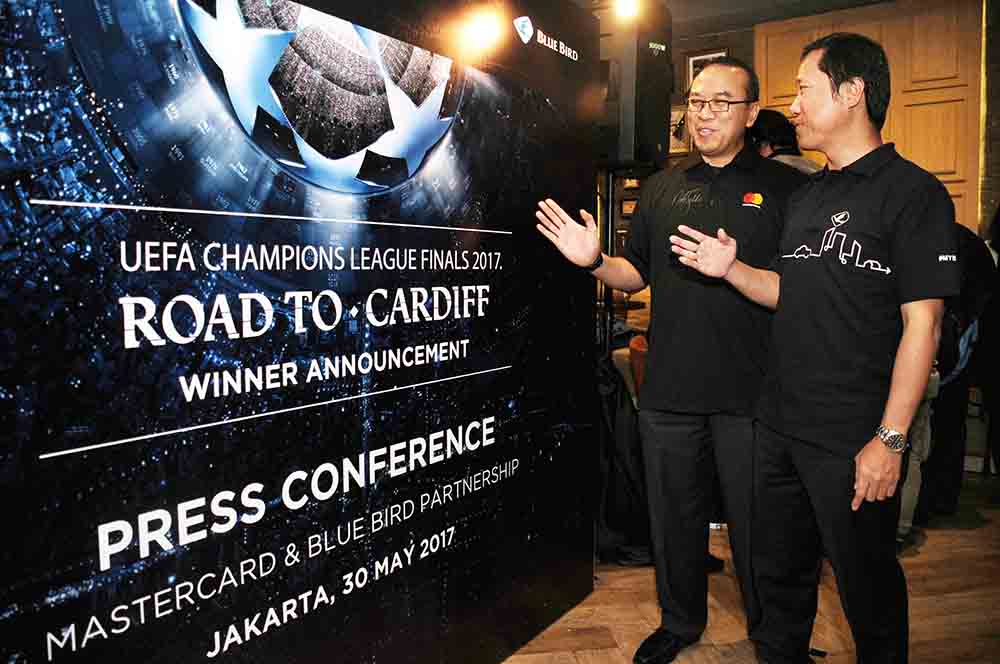 Direktur PT. Blue Bird Tbk Sigit Priawan Djokosoetono (kiri) bersama Direktur MasterCard Tommy Singgih (kanan) memberikan hadiah simbolis kepada Sriwahyuni dan Handoyo sebagai pemenang yang mendapatkan kesempatan menyaksikan langsung pertandingan final liga champion UEFA di Cardiff, Wales dalam program “Road to Cardiff” bagi konsumen setia Blue Bird dan pemegang kartu kredit Mastercard di Jakarta, Selasa 30 Mei 2017. Selain mengumumkan pemenang Blue Bird dan Mastercard juga hadirkan promo Ramadan dengan beragam potongan harga menarik bagi pelanggan setia kartu kredit Mastercard yang melakukan pemesanan taksi melalui aplikasi My Blue Bird.(*)