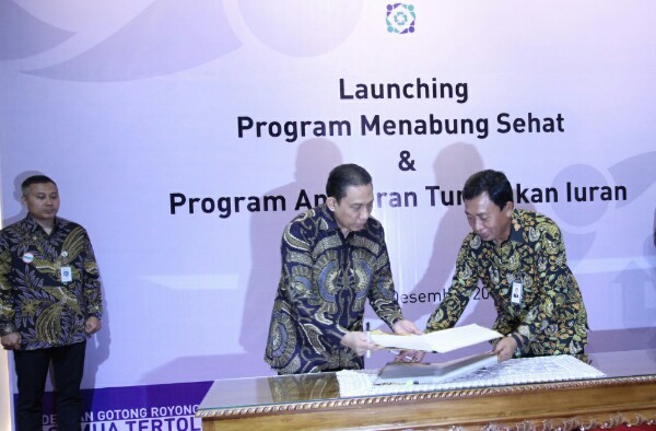 Direktur Keuangan dan Investasi BPJS Kesehatan Kemal Imam Santoso (kiri) dan Direktur Institution Bank BRI Sis Apik Wijayanto menunjukkan naskah perjanjian kerja sama usai meluncurkan program Tabungan Sehat BRI untuk peserta BPJS Kesehatan di Jakarta, Senin (18/12). Kerja sama dan terobosan ini merupakan upaya Bank BRI dan BPJS Kesehatan untuk meningkatkan pelayanan dan memberikan kemudahan kepada masyarakat untuk membayar tunggakan iuran Jaminan Kesehatan nasional BPJS Kesehatan melalui kegiatan menabung yang diberi nama Program Tabungan Sehat. (*)