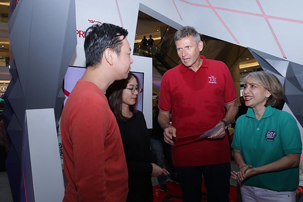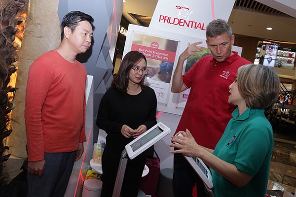 President Director Prudential Indonesia, Jens Reisch (kedua kanan) bersama Sharia, Government Relations and Community Investment Director Prudential Indonesia, Nini Sumohandoyo (kanan) berbincang dengan pengunjung di sela acara FINExpo 2019 di Jakarta, Sabtu 19 Oktober 2019. Prudential Indonesia terus berkontribusi mendorong tingkat literasi keuangan dengan memberikan pelatihan keuangan bagi lebih dari 32.000 perempuan di 35 kota di Indonesia sejak 2009, literasi untuk 2.000 anak SD kelas 1-3 di Papua, Kurikulum Cha-Ching yang telah menjangkau 84.000 anak usia 7-12 tahun sejak 2017 dan mobil literasi keuangan (SiMolek) guna mendukung program OJK meningkatkan literasi dan inklusi keuangan yang ditargetkan mencapai 35% dan 75%.