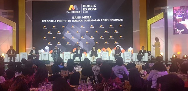 (Kiri ke kanan) Jajaran direksi PT Bank Mega Tbk Direktur Yuni Lastianto, Direktur Martin Mulwanto, Direktur Madi Darmadi Lazuardi, Direktur Utama Kostaman Thayib, Direktur Diza Larentie, Direktur Indivara Erni, Direktur Guntur Triyudianto dalam Public Expose kinerja Bank Mega tahun buku 2019 di Menara Bank Mega, Kamis (5/3/2020). Bank Mega mencatatkan kinerja laba bersih sebesar Rp2 triliun pada tahun 2019, tumbuh 25% dari Rp1,6 triliun pada 2018. (*)