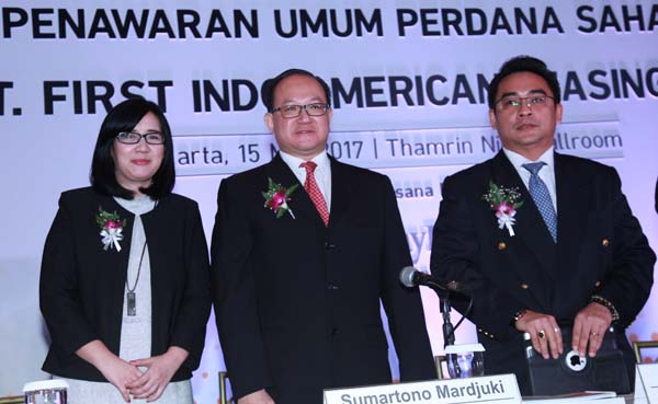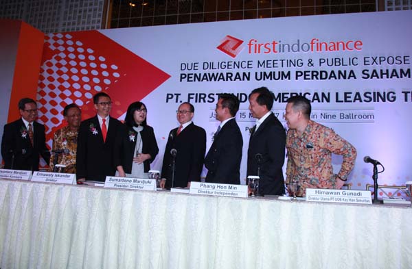 Presiden Direktur PT First Indo American Leasing Tbk (Firstindo Finance), Sumartono Mardjuki (tengah) berbincang dengan direksi lainnya usai due diligence meeting & public expose penawaran umum perdana saham di Jakarta, Senin 15 Mei 2017. Firstindo Finance, memutuskan untuk melakukan penawaran umum perdana saham (IPO) dengan melepas sebanyak-banyaknya 35 persen atau 766 juta saham baru. Masa penawaran awal berlangsung pada 12-18 Mei 2017, sedangkan masa penawaran umum 2 dan 5 Juni 2017. Sehingga, diharapkan saham Firstindo Finance bisa tercatat di Bursa Efek Indonesia (BEI) pada 8 Juni 2017.(Erman Subekti)
