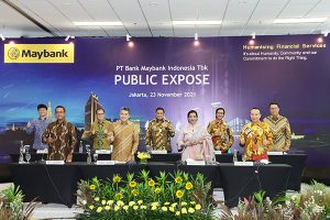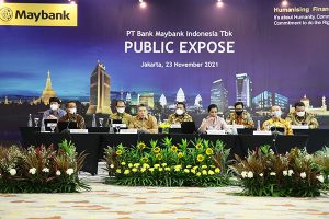 Presiden Direktur PT Bank Maybank Indonesia Tbk Taswin Zakaria (kiri ketiga) bersama jajaran direksi lainya berbincang usai menggelar Public Expose Perseroan di Jakarta, Selasa 23 November 2021. Dalam Paparan Public Expose tersebut diuraikan pencapaian kinerja Maybank Indonesia sepanjang sembilan bulan pertama tahun 2021 disampaikan, meskipun pendapatan bunga kredit dan fee-based income turun sebagai dampak dari pandemi yang masih berlanjut, laba sebelum pajak (PBT) Bank masih dapat bertumbuh sebesar 2,1% menjadi Rp1,48 triliun, naik dari Rp1,45 triliun pada periode yang sama tahun lalu hal ini didukung oleh penurunan biaya provisi, biaya dana (cost of funds) dan overhead dan langkah proaktif perseroan sebelumnya.