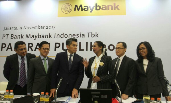 Presiden Direktur PT Bank Maybank Indonesia Tbk (Maybank Indonesia) Taswin Zakaria bersama jajaran Direksi pada Public Expose Maybank Indonesia di kantor pusat Jakarta (9/11). Maybank Indonesia mengumumkan pencapaian kinerja dengan mencatat laba bersih sebesar Rp1,4 triliun per 30 September 2017 atau naik 12,0% dibanding periode yang sama tahun lalu. (*)