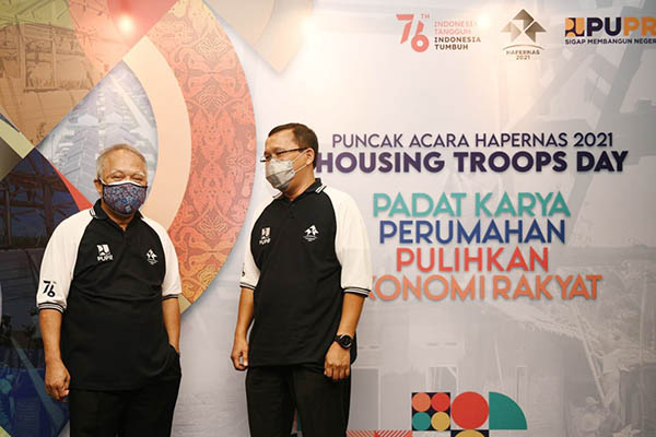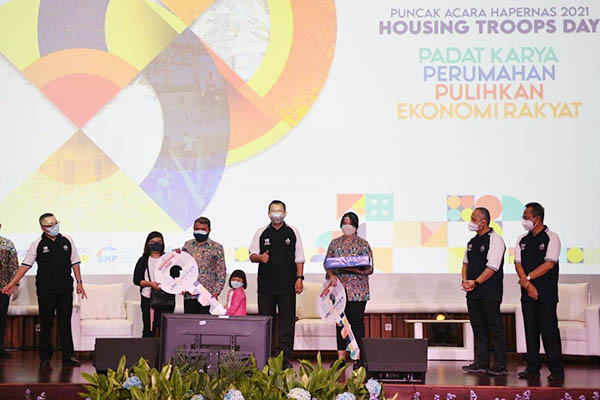 Direktur Utama PT Bank Tabungan Negara (Persero) Tbk Haru Koesmahargyo (tengah), Dirjen Perumahan Kementerian PUPR Khalawi Abdul Hamid (kiri), Dirjen Pembiayaan Infrastruktur Pekerjaan Umum & Perumahan Kementerian PUPR, Herry Trisaputra Zuna (kedua dari kanan) dan Komisioner BP Tapera, Adi Setianto (kanan) menyerahkan secara simbolis kunci rumah kepada keluarga karyawan honorer di lingkungan Kementerian PUPR pada acara akad KPR massal yang digelar saat puncak perayaan Hari Perumahan Nasional di Jakarta, Rabu, 25 Agustus 2021. Selama Hapernas digelar, Bank BTN berhasil mencatatkan 7.500 akad KPR dari seluruh kantor cabang BTN di Indonesia. Bank BTN mendukung penyediaan dan pembiayaan perumahan untuk membantu Pemerintah mengatasi backlog perumahan dan mempercepat pemulihan ekonomi.