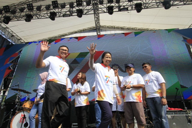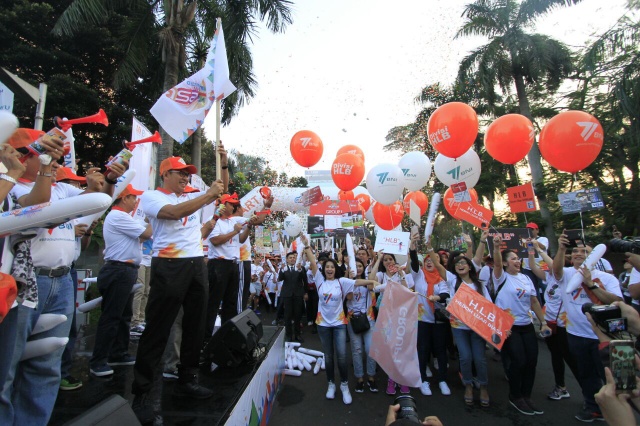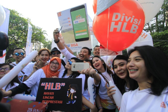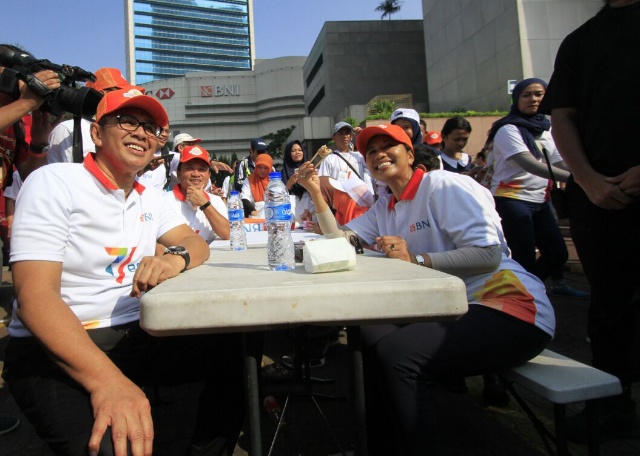 Direktur Utama BNI Baiquni bersama jajaran direksi BNI yang lain saat melepas peserta Funwalk karyawan BNI beserta keluarganya di depan Kantor Pusat BNI Jakarta,Minggu 30 Juli 2017. Turut hadir dalam festival itu Menteri BUMN Rini M Soemarno.BNI merayakan HUT ke-71 dengan menggelar Street Festival.