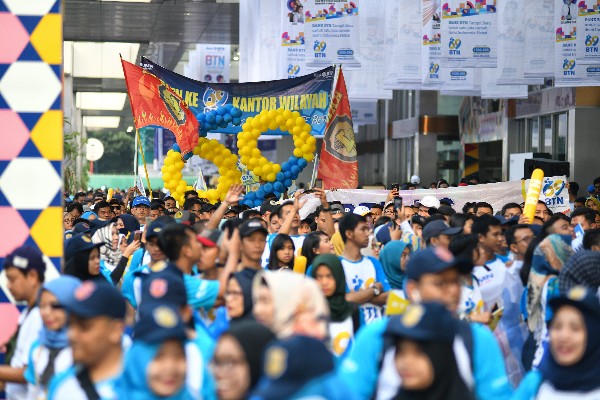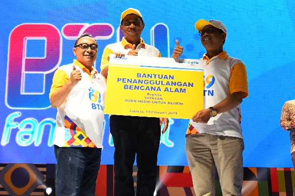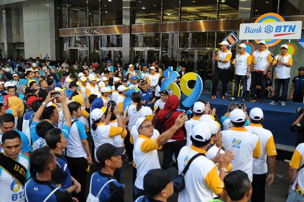 Deputi Bidang Usaha Jasa Keuangan, Jasa Konstruksi dan Jasa Lainnya Kementerian BUMN, Gatot Trihargo (kiri) dan Direktur Utama PT Bank Tabungan Negara (Persero) Tbk. Maryono (kedua kiri) bersama Komisaris Utama Bank BTN I Wayan Agus Mertayasa (kedua kanan) dan Staf Khusus Menteri Badan Usaha Milik Negara (BUMN) Sahala Lumban Gaol (kanan) mengangkat bendera start tanda dimulainya charity funwalk yang diikuti oleh lebih dari 10.000 peserta dalam rangka perayaan Hari Ulang Tahun ke 69 Bank BTN, di JCC Senayan, Jakarta, Minggu (10/2). Pada usianya yang ke-69, Bank BTN berhasil membukukan aset sebesar lebih dari Rp300 triliun dan berhasil menduduki peringkat ke lima bank terbesar dari sisi aset di Indonesia. Bank BTN yang fokus pada kredit perumahan mencatatkan kredit sekitar Rp523 triliun selama 69 tahun berdiri. (*)