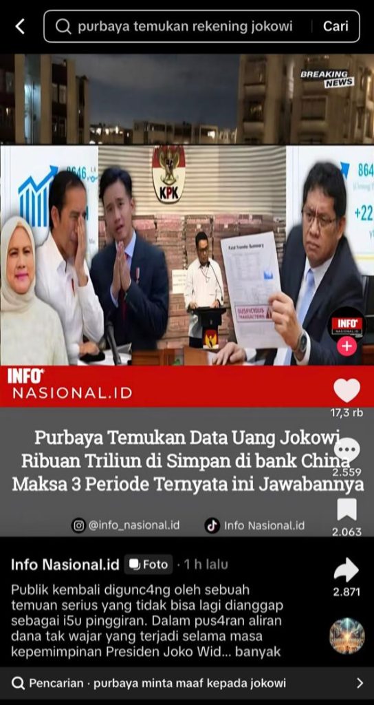 Berdasarkan penelusuran Infobanknews, Rabu malam, 14 Januari 2026, di platform media sosial TikTok dengan kata pencarian “Purbaya Temukan Rekening Jokowi” ditemukan ada sejumlah akun seperti @info.nasional.id menggunggah postingan yang menampilkan tumpukan uang di Gedung Komisi Pemberantasan Korupsi (KPK) dengan narasi sebagai berikut: