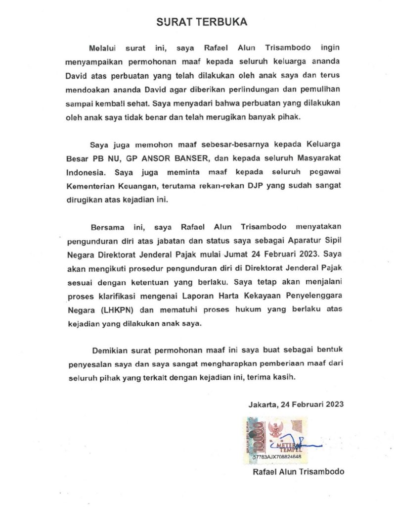 “Saya tetap akan menjalani proses klarifikasi mengenai Laporan Harta Kekayaan Penyelenggara Negara (LHKPN) dan mematuhi proses hukum yang berlaku atas kejadian yang dilakukan anak saya,” tulis Rafael dalam surat terbukanya.