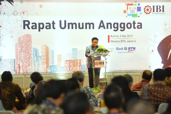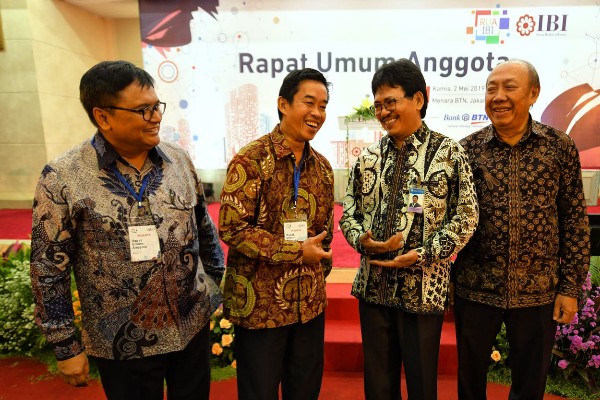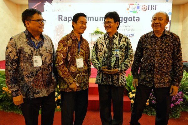 Direktur BTN Imam Nugroho Soeko (kanan) bersama Komisaris Utama BTN I Wayan Agus Mertayasa (kiri), Ketua IBI Zulkifli Zaeni (kedua kiri) pada saat menyerahkan plakat kepada Kepala Departemen Surveilans Sistem Keuangan Budi Sudiatmaka mewakili Gubernur BI, di Jakarta Kamis (2/5). Bankir Indonesia (IBI) menggelar Rapat Umum Anggota (RUA) IBI tahun 2019 untuk perubahan pengurus IBI periode 2019 sampai dengan 2023. Adapun agenda utama RUA IBI adalah pembentukan formatur pengurus IBI yang baru yang sebelumnya dipimpin oleh Zulkifli Zaeni. IBI memiliki peran strategis dalam perekonomian di Indonesia di mana IBI diharapkan mampu menyuarakan aspirasi para bankir di Indonesia guna mendorong kegiatan perbankan yang sehat dan membangun perekonomian nasional yang kuat. (*)