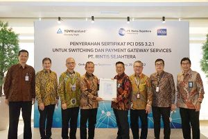 Presiden Direktur PT Rintis Sejahtera, Iwan Setiawan (kanan) menerima sertifikat Payment Card Industry Data Security Standard (PCI DSS) 3.2.1 untuk sistem pembayaran utamanya, yaitu layanan Switching dan Payment Gateway Services yang diserahkan Presiden Direktur PT TUV Rheinland Indonesia, I Nyoman Susila (kiri), di Gedung PRIMA Sejahtera, Alam Sutera, Tangerang Selatan, beberapa waktu lalu. PT Rintis Sejahtera selaku pengelola Jaringan PRIMA semakin mengukuhkan diri sebagai lembaga switching yang menghadirkan layanan transaksi finansial terpercaya berdasarkan standar sistem keamanan informasi internasional sesuai dengan ketentuan regulator. Salah satu bukti komitmen tersebut adalah dengan meraih sertifikasi Payment Card Industry Data Security Standard (PCI DSS) 3.2.1 untuk sistem pembayaran utamanya, yaitu layanan Switching dan Payment Gateway Services.
