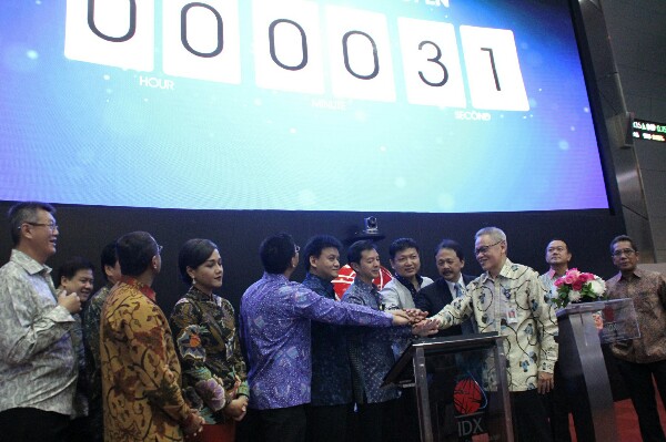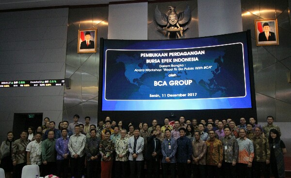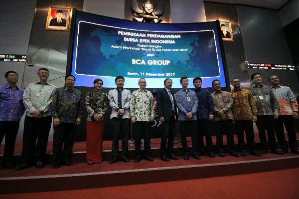 (kiri-kanan) Direktur PT BCA Insurance Antonius Tjhai, Direktur PT BCA Sekuritas Mardy Sutanto, Wakil Presiden Direktur PT Bank Central Asia Tbk (BCA) Armand W. Hartono, Direktur PT Sri Rejeki Isman Tbk Iwan Setiawan Lukminto, Direktur Utama PT Bursa Efek Indonesia (BEI) Tito Sulistio, dan Direktur BCA Rudy Susanto membunyikan bel pertanda dibukanya perdagangan bursa saham BBCA di Jakarta, Senin (11/12). Pada kesempatan tersebut, BCA juga menggelar Workshop Road to Go Public with BCA yang bertujuan memberikan awareness dan konsultasi teknis mengenai proses Go Public yang diikuti oleh sekitar 60 Debitur Korporasi dan Komersial BCA. (*)