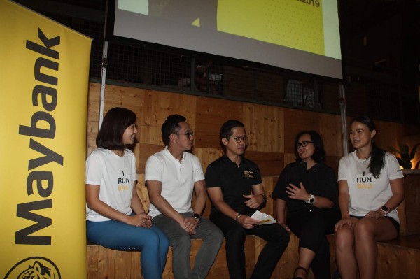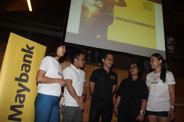 Direktur PT Bank Maybank Indonesia (Maybank Indonesia) Eri Budiono (tengah) bersama Head Corporate Communications & Branding Maybank Indonesia Esti Nugraheni (kedua dari kanan), Project Manager Maybank Bali Marathon Deniawan serta para pacer berbincang pada Road To Maybank Bali Marathon 2019, di Jakarta (3/5). Kegiatan ini yang pertama kali dari rangkaian aktivitas menuju Maybank Bali Marathon, yang mengangkat pentingnya melakukan persiapan kesehatan sebelum mengikuti lomba marathon, mencakup aspek persiapan, kesehatan dan keselamatan. Road To Maybank Bali Marathon juga memperkenalkan para pacer, yang bertambah dari tahun lalu 19 pacer menjadi 41 pacer. (*)
