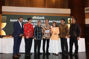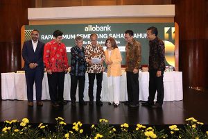 Direktur Utama Allo Bank Indra Utoyo (kedua kiri), Direktur Allo Bank Sajal Bhatnagar (kanan), Komisaris Utama Independen Aviliani (kedua kanan), dan Direktur Allo Bank Ari Yanuanto (kiri) berbincang usai Rapat Umum Pemegang Saham (RUPS) di Menara Bank Mega, Jakarta, Kamis, 19 Mei 2022. RUPS tersebut membahas di antaranya pengangkatan Indra Utoyo sebagai direktur utama, Sajal Bhatnagar sebagai direktur, Arief Tendeas sebagai direktur, Ali Gunawan Sebagai Komisaris, Gandar Raharja Rusli sebagai Direktur Kepatuhan dan Manajemen Risiko, Ari Yanuanto Asah sebagai Direktur dan Aviliani sebagai komisaris utama Perseroan.