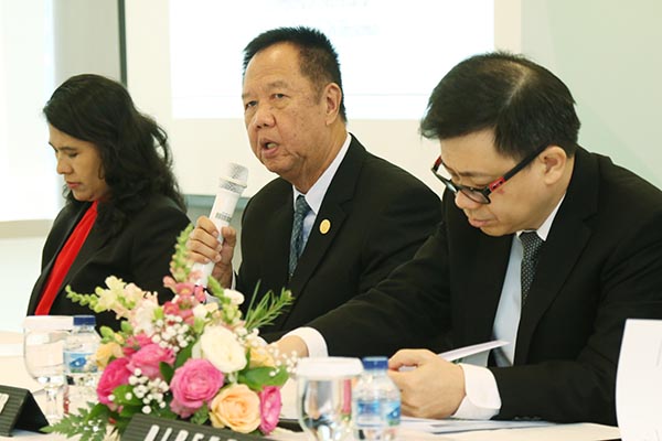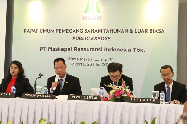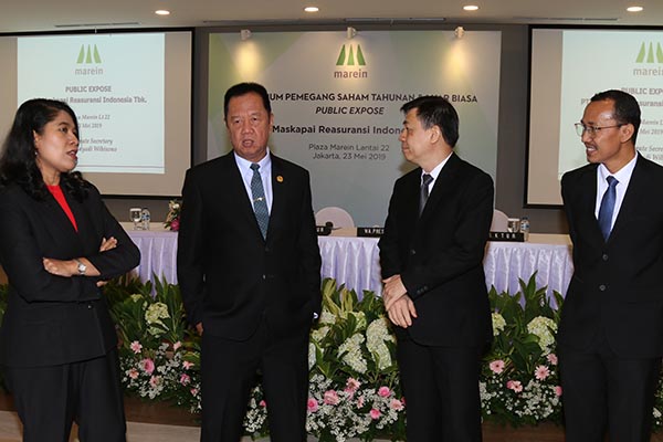 Presiden Direktur PT Maskapai Reasuransi Indonesia Tbk, (Marein), Robby Loho (kedua kiri) berbincang dengan Wakil Presiden Direktur Yanto Jayadi Wibisono (kiri), Direktur Independen Trinita Situmeang dan Direktur Fanra Budiman (kanan) usai RUPS Tahunan & Luar Biasa yang diadakan di Jakarta, Kamis 23 Mei 2019. Hingga tahun buku yang berakhir pada 31 Desember 2018, Marein membukukan pendapatan premi sebesar Rp 2,2 triliun, meningkat 22,7% dibandingkan periode tahun 2017. Sedangkan laba bersih perusahaan adalah Rp 140,9 miliar di tahun 2018 dengan ekuitas sebesar Rp1,4 triliun.