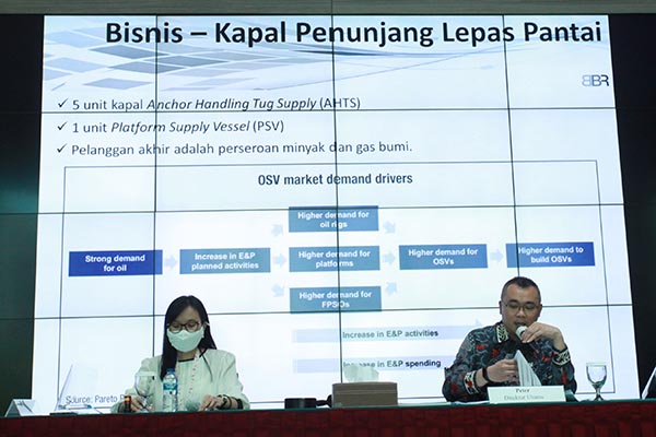 Direktur Utama PT Pelayaran Nasional Bina Buana Raya Tbk. Peter (kanan) berbincang dengan Komisaris Independen Pelayaran Nasional Bina Buana Raya Hendra Iskandar usai paparan public dan Rapat Umum Pemegang Saham Tahunan di Jakarta, Jumat, 21 Agustus 2020. Rapat Umum Pemegang Saham Luar Biasa menyetujui untuk memberikan wewenang dan kuasa kepada Direksi dengan persetujuan Dewan Komisaris untuk menjaminkan Aset Perseroan dengan nilai lebih dari 50% ekuitas untuk perolehan pendanaan guna mendukung kegiatan usaha Perseroan.