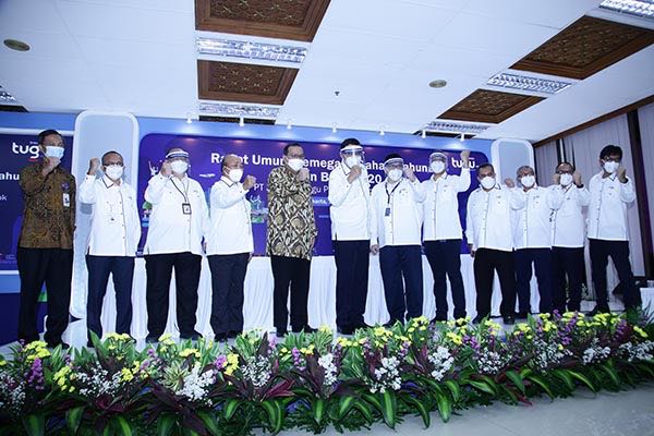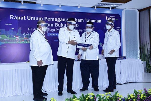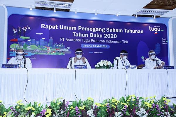 Komisaris PT Asuransi Tugu Pratama Indonesia Tbk (Tugu Insurance), Poerwo Tjahjono bersama Presiden Komisaris Koeshartanto, Direktur Teknik Syaiful Azhar Dirtek, dan Direktur Pemasaran Asuransi Migas Budi P. Amir (kiri ke kanan) sesaat sebelum Rapat Umum Pemegang Saham Tahunan, tahun buku 2020 di Jakarta, Senin, 10 Mei 2021. Dalam RUPST, Perseroan memberikan dividen sebesar Rp. 92,8 Miliar atau setara 35% dari laba tahun yang berjalan yang dapat distribusikan kepada entitas induk tahun buku 2020 kepada pemegang saham sesuai dengan porsi kepemilikan saham.