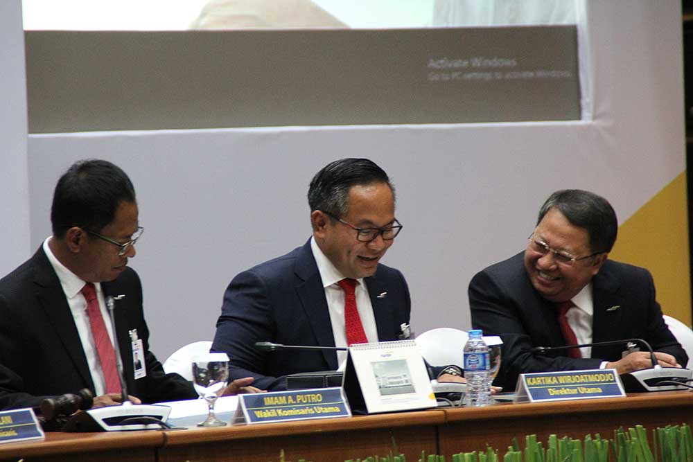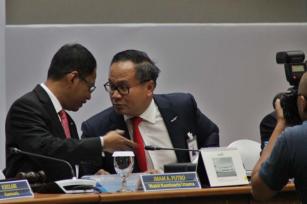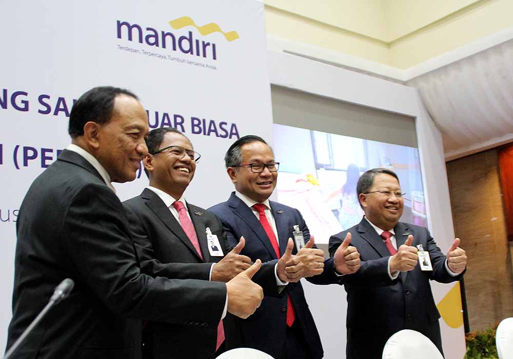 Rapat Umum Pemegang Saham Luar Biasa (RUPSLB) Bank Mandiri : Dirut Bank Mandiri Kartika Wirjoatmodjo (kedua kanan), Wakil Komisaris Utama Imam Aprianto Putro (tiga kanan), Wadirut Sulaiman A Arianto (kanan), Direktur Government and Institutional Kartini Sally (kiri) Komisaris Askolani (dua kiri), Komisaris Bangun S Kusmuljono (tiga kiri) sedang berbincang sebelum membuka RUPSLB Bank Mandiri 2017 di Jakarta, Senin 21 Agustus 2017. RUPSLB mengangkat Hartadi A Sarwono, R. Widyopramono, dan Darmawan Junaidi sebagai Komisaris Utama, Komisaris dan Direktur Treasury perseroan. Pemegang saham juga menyetujui langkah korporasi melakukan stock split dengan rasio 1:2.