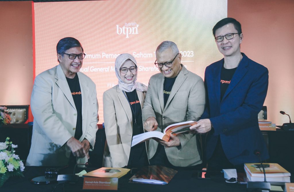 Komisaris Independen Bank BTPN Syariah Tbk, Mulya E Siregar, Direktur Dewi Nuzulianti, Komisaris Utama Independen Kemal Azis Stamboel dan Direktur Utama Bank BTPN Syariah Hadi Wibowo (kiri Ke kanan) tengah berbincang sesaat setelah acara Rapat Umum Pemegang Saham Tahunan (RUPT) PT Bank BTPN Syariah Tbk., di Jakarta, Rabu, 12 April 2023.