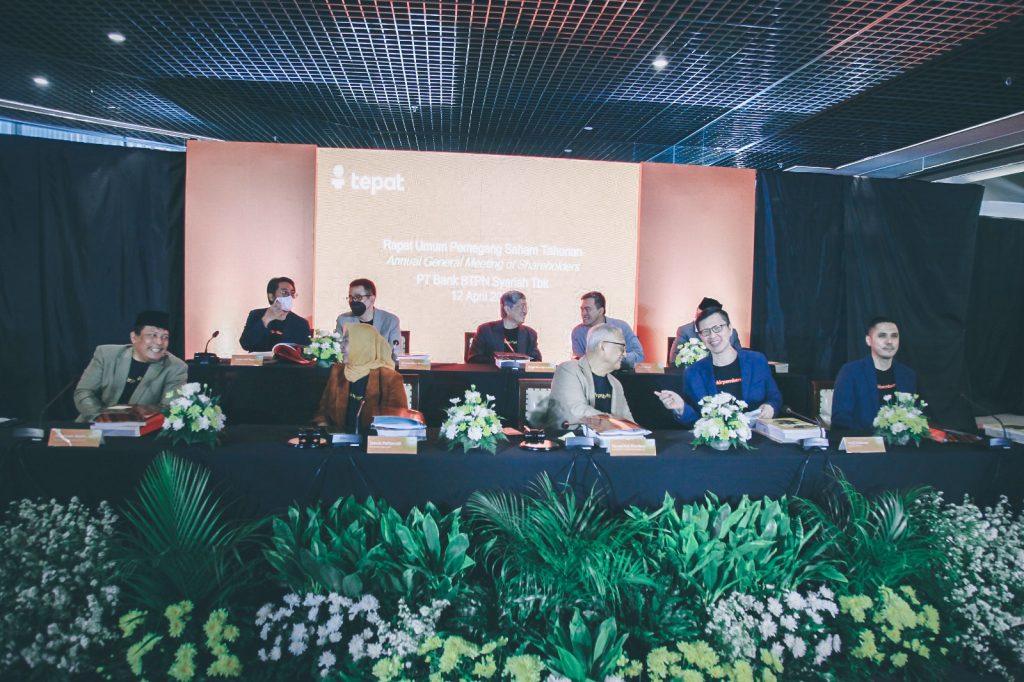 Suasana jajaran komisaris dan direksi berbincang sesaat setelah acara Rapat Umum Pemegang Saham Tahunan (RUPT) PT Bank BTPN Syariah Tbk., di Jakarta.