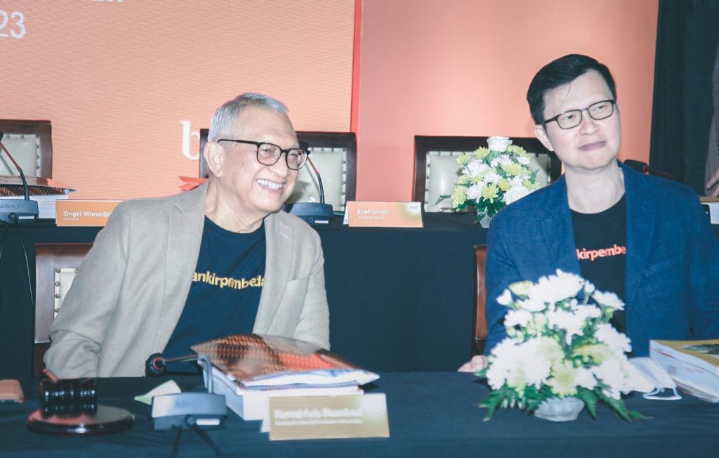 Komisaris Utama Independen Kemal Azis Stamboel berbincang dengan Direktur Utama Bank BTPN Syariah Hadi Wibowo sesaat setelah acara Rapat Umum Pemegang Saham Tahunan (RUPT) PT Bank BTPN Syariah Tbk., di Jakarta.
