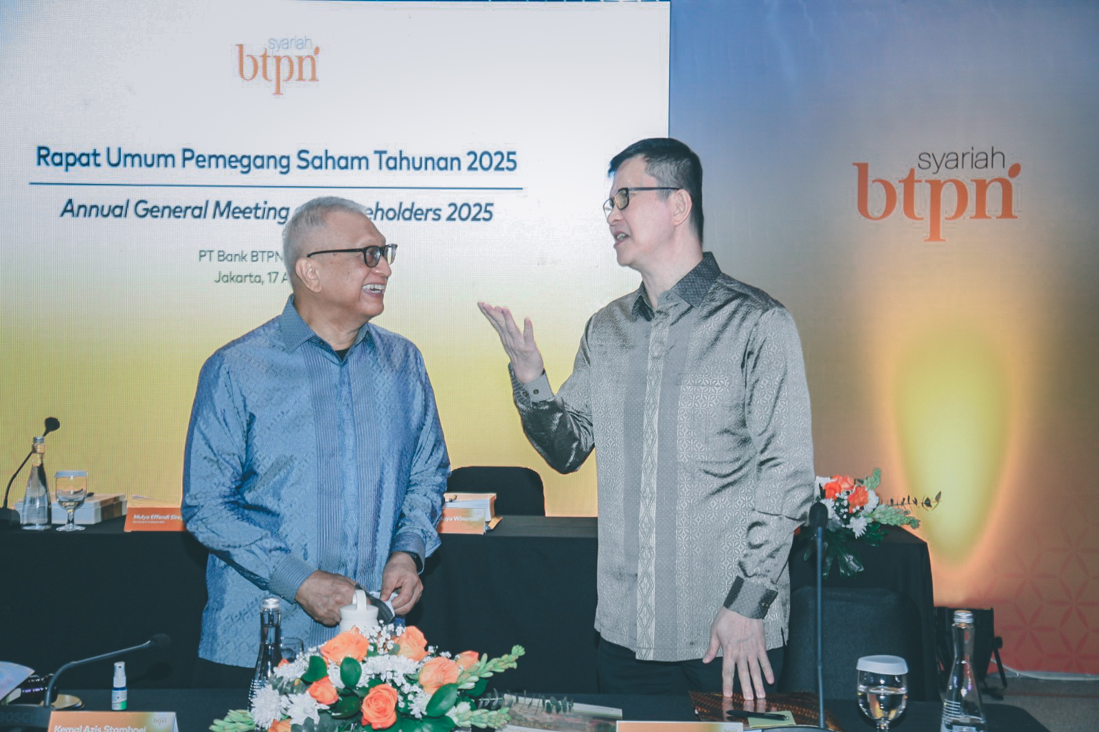 Komisaris Utama BTPN Syariah Kemal Azis Stamboel (kiri) berbincang dengan Direktur Utama BTPN Syariah Hadi Wibowo usai Rapat Umum Pemegang Saham Tahunan (RUPST) BTPN Syariah di Jakarta, Kamis 17 April 2025/Foto : Erman Subekti
