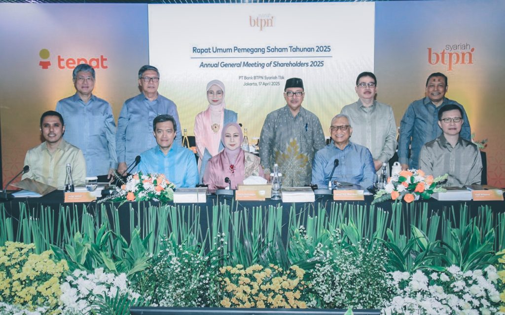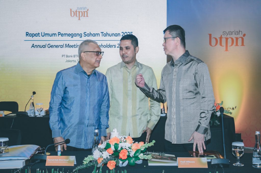 Jajaran Komisaris BTPN Syariah berfoto bersama dengan jajaran Direksi, usai Rapat Umum Pemegang Saham Tahunan, di Jakarta.Komisaris Utama BTPN Syariah Kemal Azis Stamboel (kiri) berbincang dengan Direktur BTPN Syariah Fachmy Achmad (tengah), dan Direktur Utama BTPN Syariah Hadi Wibowo usai Rapat Umum Pemegang Saham Tahunan (RUPST) BTPN Syariah di Jakarta, Kamis 17 April 2025.