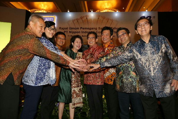 Presiden Direktur dan CEO PT Nippon Indosari Corpindo Tbk Wendy Yap (keempat kiri) dan Presiden Komisaris Benny Setiawan Santoso (keempat kanan) serta jajaran Komisaris dan Direksi berbincang usai Rapat Umum Pemegang Saham Tahunan (RUPST) di Jakarta, Jumat 11 Mei 2018. Sepanjang tahun 2017 PT Nippon lndosari Corpindo Tbk (ROTI) berhasil mencatatkan penjualan neto sebesar Rp2,49 triliun dengan kontribusi terbesar terhadap produk perseroan, yakni roti tawar dan roti manis. (*)