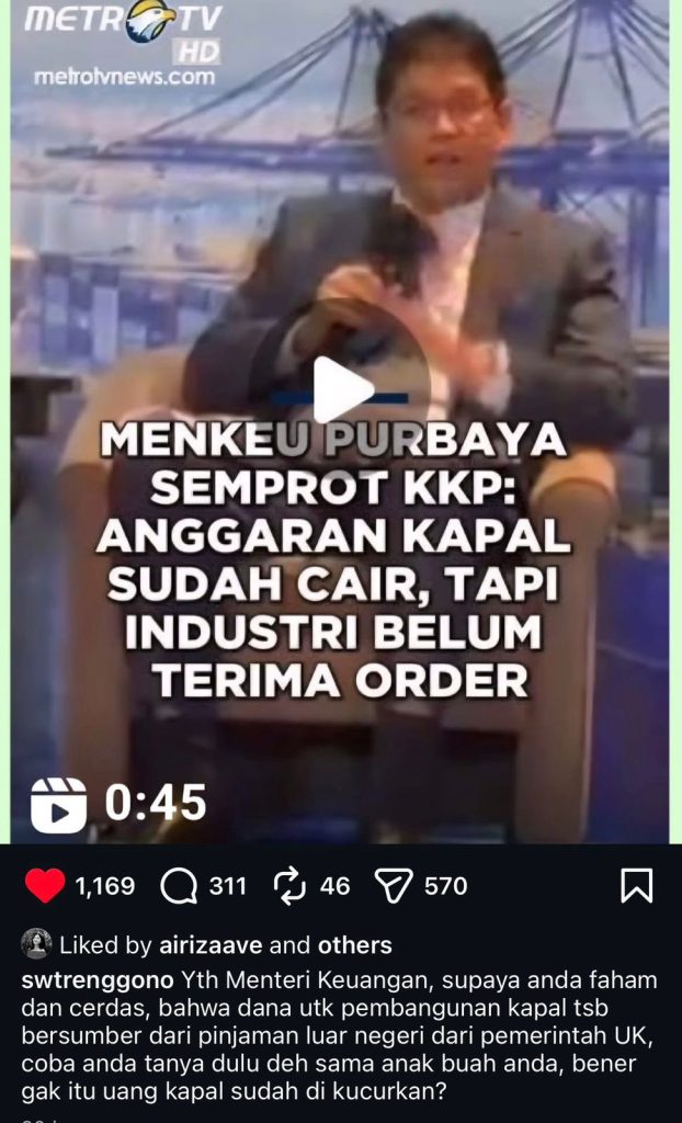 Dalam forum tersebut, Purbaya mengaku heran lantaran para pengusaha galangan kapal menyampaikan bahwa mereka belum menerima pesanan pembangunan kapal dari Kementerian Kelautan dan Perikanan (KKP). Padahal, menurutnya, anggaran pengadaan kapal untuk KKP telah dikucurkan oleh Kemenkeu.