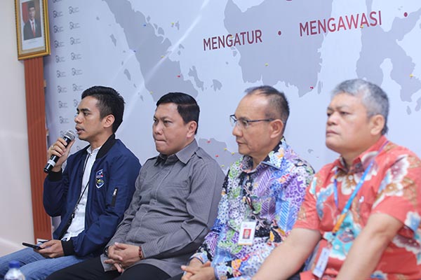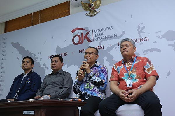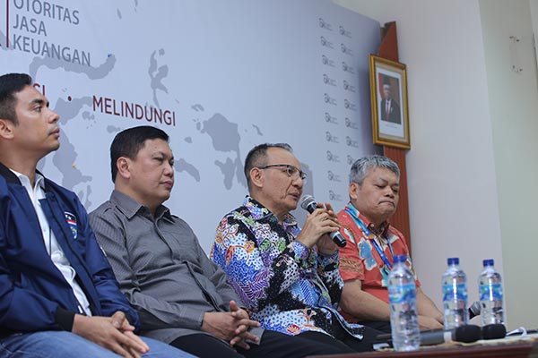 Ketua Satgas Waspada Investasi Tongam L. Tobing (kedua kanan), Kombes Pol Kasubdit Jaksi Thomas Widodo (kedua kiri), Direktorat Siber Polri Kompol Silvester Simamora (kiri), Plt Direktur Pengendalian Aplikasi Informatika Anthonius Malau (kanan) usai memberikan penjelasan tentang Satgas Waspada Investasi di Jakarta, Kamis 31 Oktober 2019. Satgas Waspada Investasi bersama 13 kementrian/lembaga yang menjadi anggotanya berinisiatif membuka layanan pengaduan, konsultasi dan sosialisasi langsung mengenai berbagai persoalan terkait investasi, fintech lending dan gadai swasta ilegal kepada masyarakat dengan membuka “Warung Waspada Investasi”.