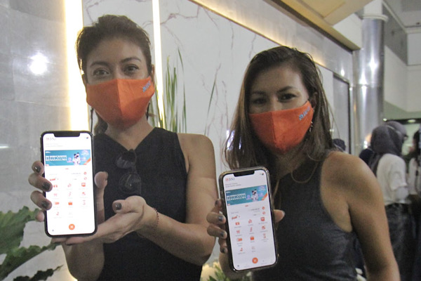 Marianne Rumantir (kanan) dan Sigi Wimala (kiri) menunjukkan aplikasi BNI Mobile Banking.