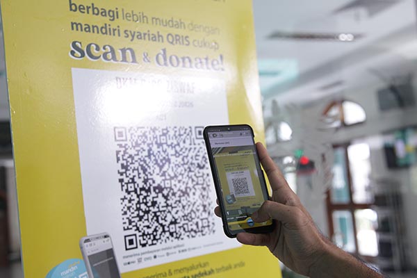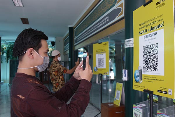 Karyawan tengah bersedekah menggunakan Quick Response Code Indonesia Standard (QRIS) melalui Mandiri Syariah Mobile di Masjid kantor Bea Cukai, Jakarta, Jumat 12 Juni 2020. Di Era New Normal, Bank Mandiri Syariah mengimbau nasabah mengoptimalkan metode pembayaran QRIS sebagai solusi pembayaran digital yang mudah, cepat, nyaman dan aman di Era New Normal. Hingga Mei 2020, Mandiri Syariah telah bekerjasama dengan lebih dari 9.000 merchant termasuk merchant komersial, 2.300 masjid dan lembaga ziswaf.