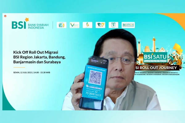 Direktur Utama PT Bank Syariah Indonesia Tbk (BSI) Hery Gunardi bersama segenap Direksi, SEVP, dan Regional CEO BSI melakukan scan QRIS menggunakan BSI Mobile pada acara kick off roll out BSI tahap akhir secara virtual di Jakarta, Senin, 12 Juli 2021. Sebagai wujud kepedulian terhadap pandemi COVID-19, BSI didukung oleh Yayasan BSMU menggelar Sedekah Serentak secara virtual melalui layanan BSI Mobile. Layanan digital banking ini dapat memudahkan masyarakat dalam bersedekah dan berbagi secara cepat, aman, dan nyaman kapanpun dan dimanapun. Diharapkan fitur ini dapat memberikan berkontribusi untuk masyarakat yang terkena musibah/bencana salah satunya terkait pandemi COVID-19 yang terjadi saat ini.