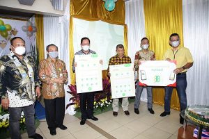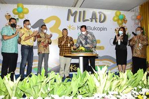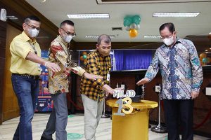 Direktur Utama PT Bank KB Bukopin Syariah (KBBS) Hari Wurianto (kanan) berbicang dengan Direktur Bank KB Bukopin Syariah Adil Syahputra (kiri) dan Komisaris komisariat utama independen Mustafa Abubakar (tengah) saat Tasyakuran, re-Launching Mobile Banking (BISA-Mobile) dan Logo KB Bukopin Syariah di Kantor Pusat, Salemba – Jakarta, Kamis, 9 Desember 2021. Re-Launching Mobile Banking (BISA-Mobile) dan Logo KB Bukopin Syariah merupakan rangkaian acara Milad ke 13 Bank KB Bukopin Syariah.