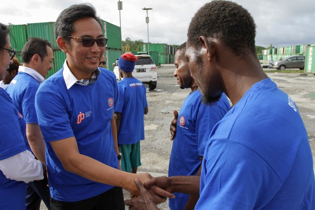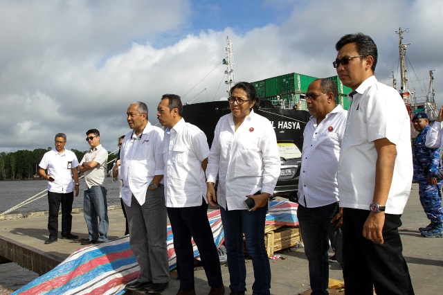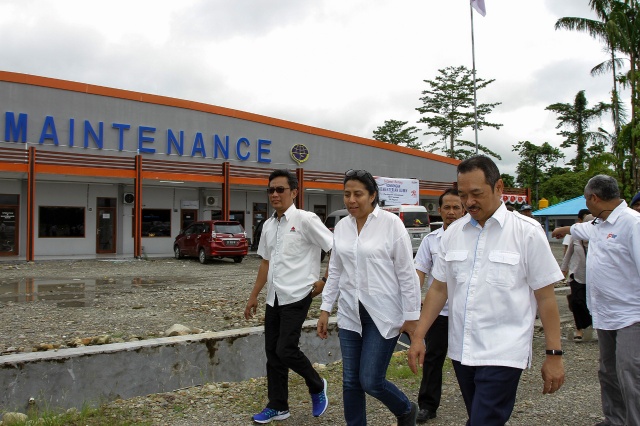 Direktur Pemasaran dan Supply Chain Semen Indonesia Ahyanizzaman bersama Deputi Bidang Usaha Pertambangan dan Industri Strategis Fajar Harry Sampurno dan Direktur Komersial PT Perusahaan Perdagangan Indonesia Trisilo Ari Setyawan saat meninjau kesiapan Pelabuhan Timika dan Bandara Mozes Kilangin untuk pendistribusian Semen di wilayah Papua.Kamis 10 Agustus 2017.Diharapkan biaya distribusi semen bisa lebih efisien sehingga harga semen nantinya lebih murah.