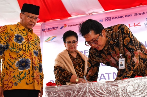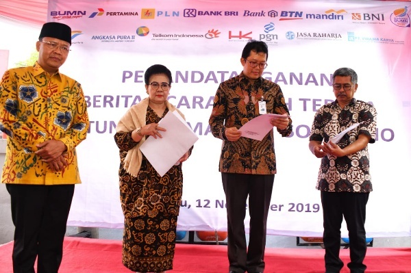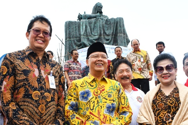Direktur Compliance PT Bank Tabungan Negara (Persero) Tbk R Mahelan Prabantarikso (kedua kanan) menyerahkan Patung Fatmawati kepada Ketua Yayasan Fatmawati Hildawati Hasan Din disaksikan oleh Gubernur Bengkulu Rohidin Mersyah (kanan) dan Direktur PT Siluet Nyoman Nuarta Djuki Ridwan di Bengkulu, selasa (12/11). Serah terima patung ini merupakan akhir dari tugas yang diberikan kepada Bank BTN sebagai koordinator dari 12 BUMN sebagai donatur pembuatan patung tersebut dalam program BUMN Hadir Untuk Negeri di wilayah Bengkulu. Patung ini diharaplan menjadi icon kota Bengkulu sekaligus menjadi momentum dalam memberi nilai tambah sebagai destinasi sejarah bangsa yang menjadi kebanggaan masyarakat Bengkulu. (*)